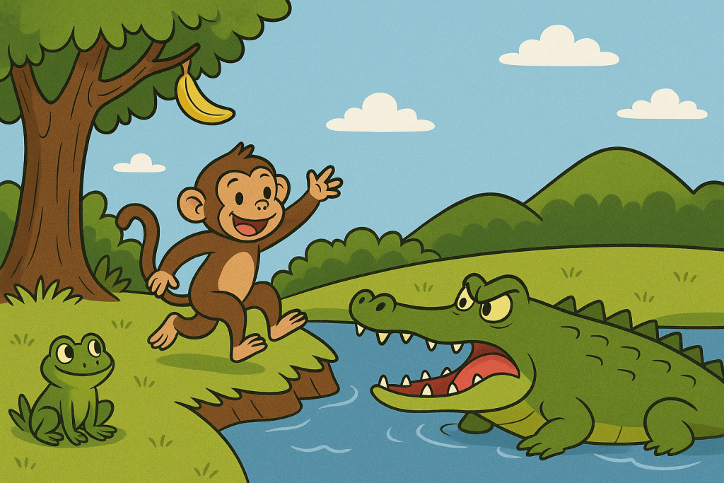 “The Clever Monkey and the Hungry Crocodile” is a fun and witty play based on an old Indian folktale. It teaches children the importance of thinking quickly in dangerous situations. In this story, a monkey wants bananas, a crocodile wants the monkey’s brain, and a frog just wants to help… or cause trouble! This short play is perfect for classroom performances and storytelling activities.